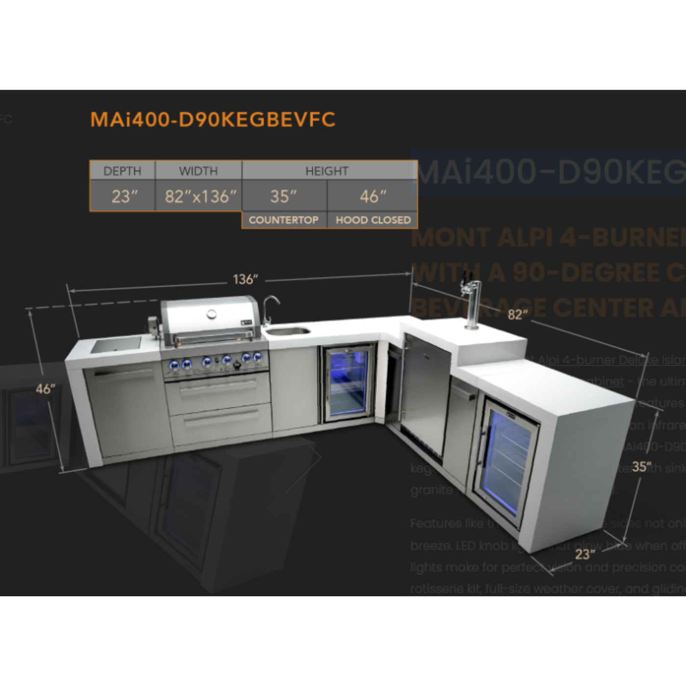 {"id":7984105095221,"title":"MONT ALPI 4-BURNER DELUXE ISLAND WITH A 90-DEGREE CORNER, KEGERATOR, BEVERAGE CENTER AND FRIDGE CABINET","handle":"mont-alpi-4-burner-deluxe-island-with-a-90-degree-corner-kegerator-beverage-center-and-fridge-cabinet","description":"\u003cp class=\"preFade fadeIn\"\u003eIntroducing the\u003cspan\u003e \u003c\/span\u003e\u003cspan\u003eMont Alpi 4-burner Deluxe Island with a 90-degree corner, kegerator, beverage center and fridge cabinet\u003c\/span\u003e\u003cspan\u003e \u003c\/span\u003e- the ultimate deluxe outdoor kitchen island for your backyard or patio. This all-in-one grill features four burners, an infrared side burner for searing, pan-frying, and boiling, and an infrared rear burner for the ultimate rotisserie experience. But that's not all – The MAi400-D90KEGBEVFC also includes a 90-degree 3 pour kegerator module, a beverage center with sink and outdoor rated, lockable fridge, and a granite matching chopping board.\u003c\/p\u003e\n\u003cp class=\"preFade fadeIn\"\u003eFeatures like the waterfall granite sides not only add to the classy look but make cleaning a breeze. LED knob lights that glow blue when off and red when on, and bright internal cooking lights make for perfect vision and precision control. Plus, this grill also includes a heavy-duty rotisserie kit, full-size weather cover, and gliding rubber castor wheels with leveling feet.\u003c\/p\u003e\n\u003cp class=\"preFade fadeIn\"\u003eThe grill itself outputs 78,000 BTUs of heat and features all 304 stainless steel components, including four burners, 8mm cooking grills, and a warming rack. It also includes ceramic infrared rear and side burners, two cooking surface halogen lights, and an easy-access grease tray for cleaning.\u003c\/p\u003e\n\u003cp class=\"preFade fadeIn\"\u003eAll Mont Alpi Deluxe series outdoor kitchens come propane-ready but can be converted to natural gas within minutes with the additional Mont Alpi Natural Gas conversion kit. \u003c\/p\u003e\n\u003cp class=\"preFade fadeIn\"\u003eAnd the best part? It's delivered fully assembled, so you can start grilling and chilling right away.\u003c\/p\u003e\n\u003ch4 class=\"preFade fadeIn\"\u003e\u003cstrong\u003eKey Features and Dimensions\u003c\/strong\u003e\u003c\/h4\u003e\n\u003cul data-rte-list=\"default\"\u003e\n\u003cli\u003e\n\u003cp class=\"preFade fadeIn\"\u003e4-burner grill unit - 32\"x23\"x47\"\u003c\/p\u003e\n\u003c\/li\u003e\n\u003c\/ul\u003e\n\u003cul data-rte-list=\"default\"\u003e\n\u003cli\u003e\n\u003cp class=\"preFade fadeIn\"\u003e90-degree corner cart - 23\"x25\"x35\"\u003c\/p\u003e\n\u003c\/li\u003e\n\u003cli\u003e\n\u003cp class=\"preFade fadeIn\"\u003eOutdoor rated, lockable fridge - 25\"x23\"x35\"\u003c\/p\u003e\n\u003c\/li\u003e\n\u003cli\u003e\n\u003cp class=\"preFade fadeIn\"\u003eLeft side burner unit - 25\"x23\"x35\"\u003c\/p\u003e\n\u003c\/li\u003e\n\u003cli\u003e\n\u003cp class=\"preFade fadeIn\"\u003eKegerator - 48\"x23\"x35\"\u003c\/p\u003e\n\u003c\/li\u003e\n\u003cli\u003e\n\u003cp class=\"preFade fadeIn\"\u003eBeverage center with sink and fridge - 38\"x23\"x35\"\u003c\/p\u003e\n\u003c\/li\u003e\n\u003c\/ul\u003e\n\u003ch4 class=\"preFade fadeIn\"\u003e\u003cstrong\u003e4-Burner Deluxe - standard features\u003c\/strong\u003e\u003c\/h4\u003e\n\u003cul data-rte-list=\"default\"\u003e\n\u003cli\u003e\n\u003cp class=\"preFade fadeIn\"\u003e78,000 BTU Heat output\u003c\/p\u003e\n\u003c\/li\u003e\n\u003cli\u003e\n\u003cp class=\"preFade fadeIn\"\u003eCooking surface 28”x18” (exc. Warming rack)\u003c\/p\u003e\n\u003c\/li\u003e\n\u003cli\u003e\n\u003cp class=\"preFade fadeIn\"\u003eAll 304 Stainless Steel components-\u003c\/p\u003e\n\u003c\/li\u003e\n\u003cul data-rte-list=\"default\"\u003e\n\u003cli\u003e\n\u003cp class=\"preFade fadeIn\"\u003eFour 304 Stainless Steel Burners\u003c\/p\u003e\n\u003c\/li\u003e\n\u003cli\u003e\n\u003cp class=\"preFade fadeIn\"\u003e8mm 304 Stainless Steel Cooking Grills\u003c\/p\u003e\n\u003c\/li\u003e\n\u003cli\u003e\n\u003cp class=\"preFade fadeIn\"\u003eWarming Rack 304 Stainless Steel\u003c\/p\u003e\n\u003c\/li\u003e\n\u003c\/ul\u003e\n\u003cli\u003e\n\u003cp class=\"preFade fadeIn\"\u003eCeramic infrared rear and side burners\u003c\/p\u003e\n\u003c\/li\u003e\n\u003cli\u003e\n\u003cp class=\"preFade fadeIn\"\u003eTwo Cooking Surface Halogen Lights\u003c\/p\u003e\n\u003c\/li\u003e\n\u003cli\u003e\n\u003cp class=\"preFade fadeIn\"\u003eRotisserie Kit with Electric Motor\u003c\/p\u003e\n\u003c\/li\u003e\n\u003cli\u003e\n\u003cp class=\"preFade fadeIn\"\u003eWhite granite surfaces and waterfall sides\u003c\/p\u003e\n\u003c\/li\u003e\n\u003cli\u003e\n\u003cp class=\"preFade fadeIn\"\u003eEasy access grease tray for cleaning\u003c\/p\u003e\n\u003c\/li\u003e\n\u003cli\u003e\n\u003cp class=\"preFade fadeIn\"\u003eBottle Opener\u003c\/p\u003e\n\u003c\/li\u003e\n\u003cli\u003e\n\u003cp class=\"preFade fadeIn\"\u003eWeather Cover\u003c\/p\u003e\n\u003c\/li\u003e\n\u003cli\u003e\n\u003cp class=\"preFade fadeIn\"\u003eTemperature Gauge\u003c\/p\u003e\n\u003c\/li\u003e\n\u003cli\u003e\n\u003cp class=\"preFade fadeIn\"\u003eElectronic Ignition\u003c\/p\u003e\n\u003c\/li\u003e\n\u003cli\u003e\n\u003cp class=\"preFade fadeIn\"\u003eGranite Chopping Board\u003c\/p\u003e\n\u003c\/li\u003e\n\u003cli\u003e\n\u003cp class=\"preFade fadeIn\"\u003eLarge Roller Ball Drawers\u003c\/p\u003e\n\u003c\/li\u003e\n\u003cli\u003e\n\u003cp class=\"preFade fadeIn\"\u003eOn\/Off red\/blue changing color control knob lights\u003c\/p\u003e\n\u003c\/li\u003e\n\u003cli\u003e\n\u003cp class=\"preFade fadeIn\"\u003eGliding Rubber Castor Wheels and Leveling Feet\u003c\/p\u003e\n\u003c\/li\u003e\n\u003cli\u003e\n\u003cp class=\"preFade fadeIn\"\u003ePropane Ready, easily Convertible to Natural Gas\u003c\/p\u003e\n\u003c\/li\u003e\n\u003cul data-rte-list=\"default\"\u003e\n\u003cli\u003e\n\u003cp class=\"preFade fadeIn\"\u003ePropane Hose and Regulator\u003c\/p\u003e\n\u003c\/li\u003e\n\u003cli\u003e\n\u0